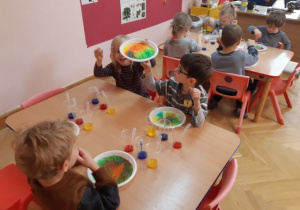 Podczas warsztatów "Dociekliwego przedszkolaka dzieci mieszały barwy podstawowe, nazywały barwy pochodne. Poznawały też odcienie barw. Tworzenie rozmaitych obrazów niezwykle pobudzało dziecięcą wyobraźnię.