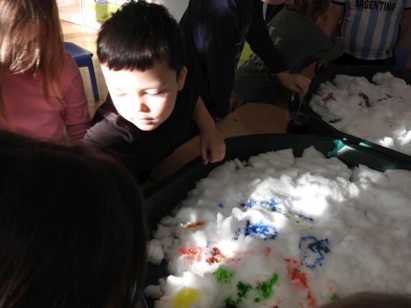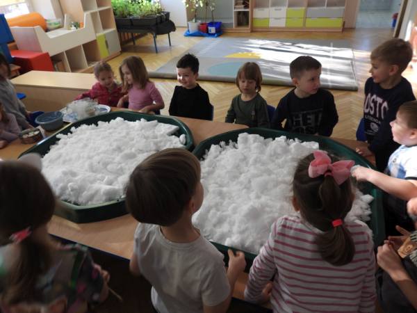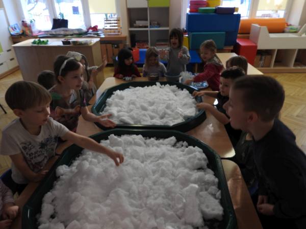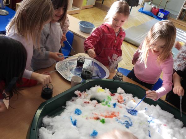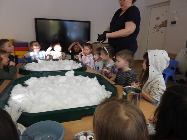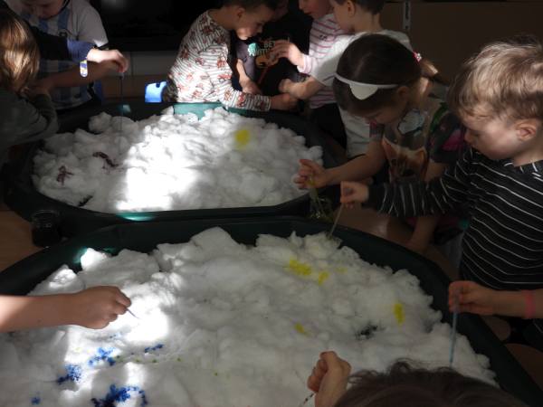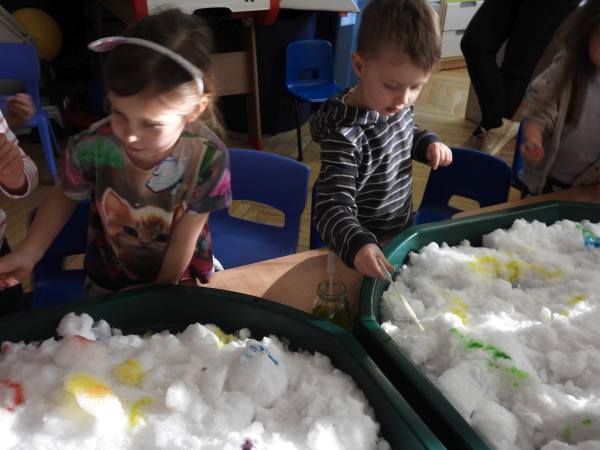 "Sensoryczna zima - dotknij i zakoloruj" Dziś zamieniliśmy się w małych artystów i malowaliśmy..... śnieg. Przy pomocy kolorowych barwników dzieci z radością eksperymentowały, mieszały kolory i tworzyły prawdziwe zimowe dzieła sztuki. To połączenie sensoplastyki z terapią ręki – dzieci doświadczały różnych faktur, temperatur i kolorów, jednocześnie ćwicząc motorykę małą, siłę dłoni, koordynację oraz precyzję ruchów. Zabawa sensoryczna to nie tylko radość i eksperymentowanie, ale też ważne wsparcie rozwoju